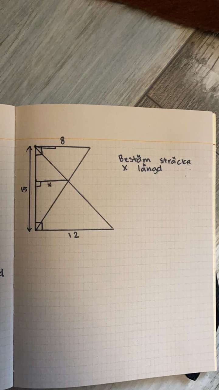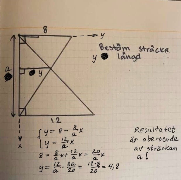 Den undre är då 15-y.Ställ upp likformighetsekvationer för var och en av de två rätvinkliga trianglarna med kort katet 8 respektive 12.