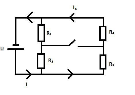 Hur beräknar man strömmen I och I₄ efter att strömbrytaren stängs om man vet I och I₄ innan, samt alla motstånd, och U?