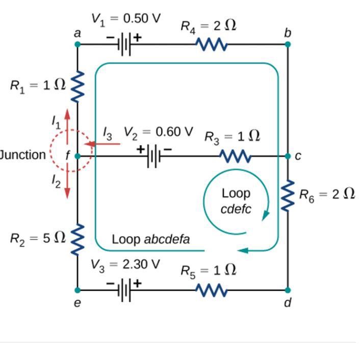 Ekv 2. Vi går runt i den stora gröna loopen (abcdefa) då gäller att när man går i strömmens riktning så får vi ett potentialfall när vi passerar ett motstånd. (och tvärtom förstås) Passerar vi spänningskällor från - till + höjer vi potentialen och tvärtom Börja vid a: