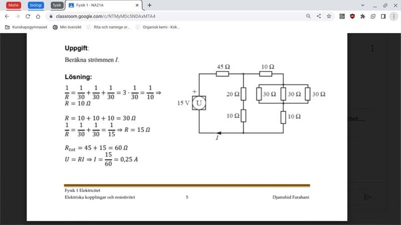 Sen räknar de ut ersättningsmotståndet för detta 10 ohms och de två andra 10 ohms som ligger i serier med det och kommer fram till att det är 30 ohm (seriekopplade adderas)