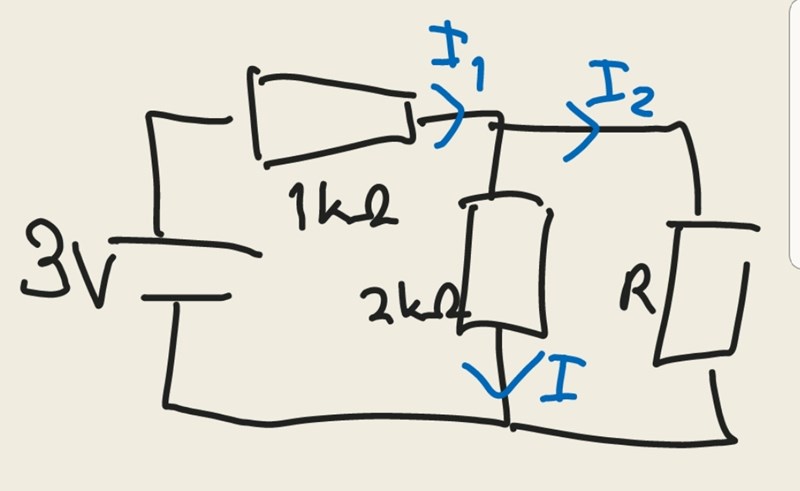 Har räknat ut den totala ersättningsresistansen till 2000 ohm och strömmen över batteriet och ersättningsresistansen till 0,0015A. Hur ska jag sedan beräkna strömmen I?