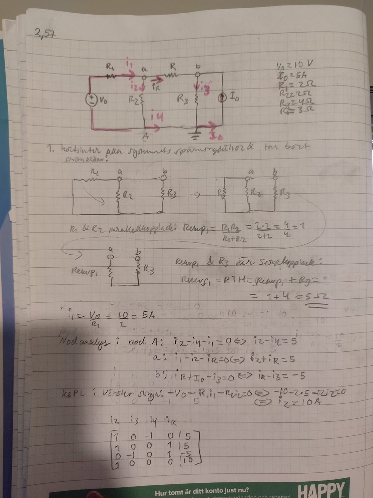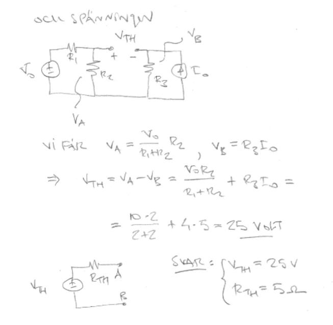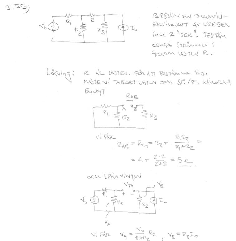 Hej! Jag försöker lösa denna uppgift och lyckas räkna ut rätt thevenin resistans men inte rätt ström och har inte börjat på thevenin spänningen än. Vet inte rikitgt vad jag gör fel? Jag förstår lösningsförslagets tanke så det kanske är bättre att göra så istället? dock har lösningsförslaget och facit olika svar så vet inte vilket som är rätt? Lösningsförslaget har dessutom inte beräknat iR.