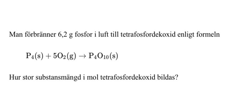 jag håller på med denna fråga som du ser nedan. Jag läste den genom att först kolla på förhållandet mellan produkten och reaktanten, vilket var 1:1. Så då tog jag reda på Fosforns substansmängd, vilket är n = m/M det blir då n = 6,3 / 30,973761 = 0,200 mol. Men detta var fel svar. Tydligen ska det bli 0,050 mol och jag förstår inte hur? Jag har ju gjort allting rätt…? Eller?