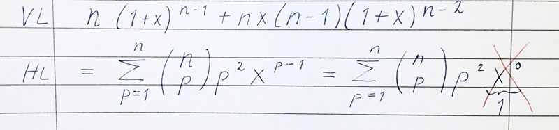 Smutsmunnen, du har rätt i att jag inte får någon term med i HL när p=1, för då blir ju exponenten 0 och värdet är därmed 1. Är det så du menar? Hur kan man få bort x-termen för alla andra p? Jag har väl inte deriverat fel i HL också?