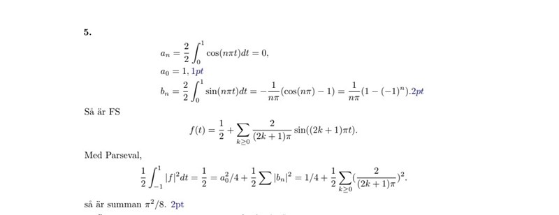 Jag använde för länge sedan Fourier för att visa Summa(1/k2) = pi2/6, men minns inte att det var så här krångligt. Jag hörde långt senare ett föredrag där man använde summan för att beräkna sannolikheten att två slumpvis valda heltal har en gemensam faktor. Weird.