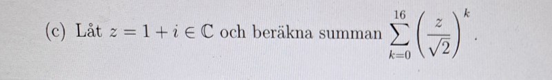 Jag vet inte om vi ska upphöja z med 16 och sen räkna ut så att vi får z^16=2^8(cos(16pi/64)+isin(16pi/64)). Isåfall får jag detta svar på z^16 och summan.