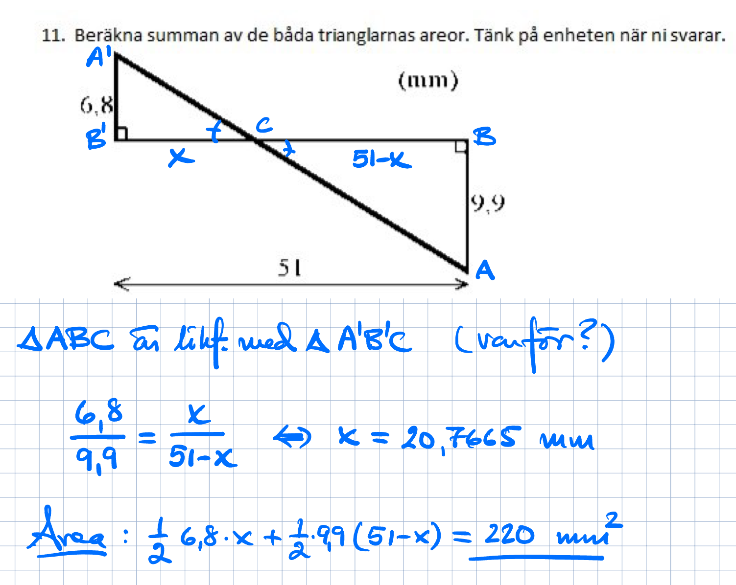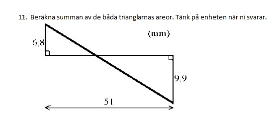 Beräkna summan av de båda trianglarnas areor, (tänk på enhet när man svarar)!