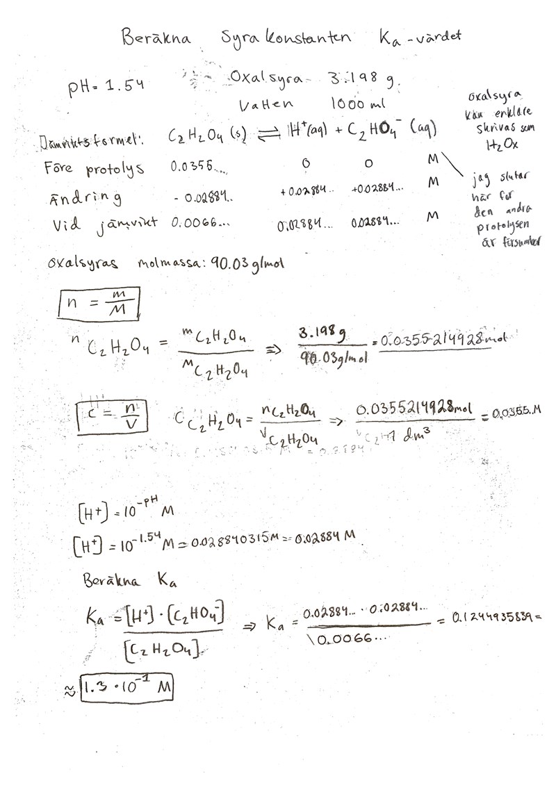 hej! i den här uppgiften ska jag räkna ut Ka för oxalsyra. ph=1.54, Volym 1000ml = 1dm^3.