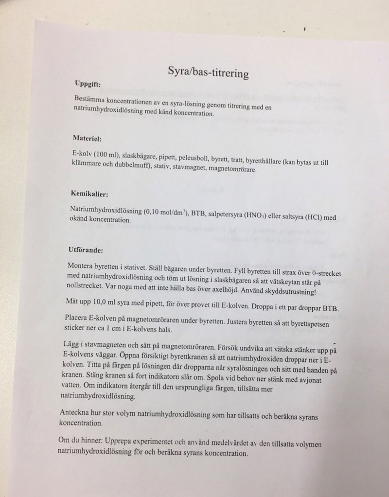 Vilken volym hade NaOH-lösningen? Vilken koncentration hade NaOH-lösningen? Vilken substansmängd av hydroxidjoner hade du alltså?