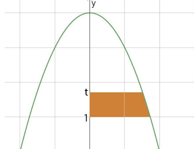 Det färgade tvärsnittet från samma graf roterar runt y-axeln från y = 1 till y = t där t är en konstant större än 1. Rotationsvolymen av det färgade området är 5 pi volymenheter. Funktionen är densamma som i a) uppgiften f (x) = 4 − x. Beräkna t.