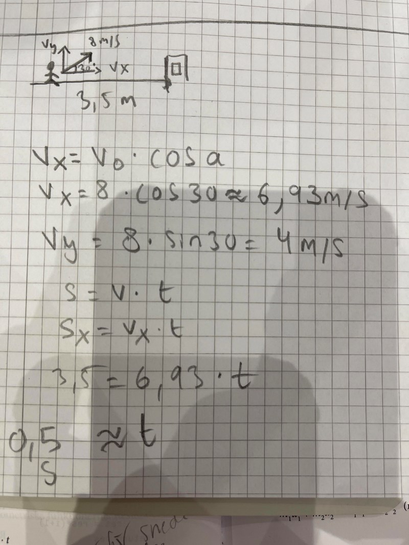 Peter kastar en boll mot en garageport 3,5 m bort. Bollens hastighet är 8,0m/s och den kastas snett uppåt med en vinkel mot markplanet på 30grader. Efter hur lång tid når bollen garageporten? bortse från luftmotståndet