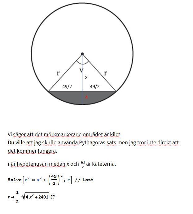 Låt oss kalla 4cm sträckan för a och halva 49cm sträckan för b. Förläng sedan symmetrilinjen till hela diametern och dra en linje från diameterns ändpunkt till b-sträckans yttre ändpunkt.