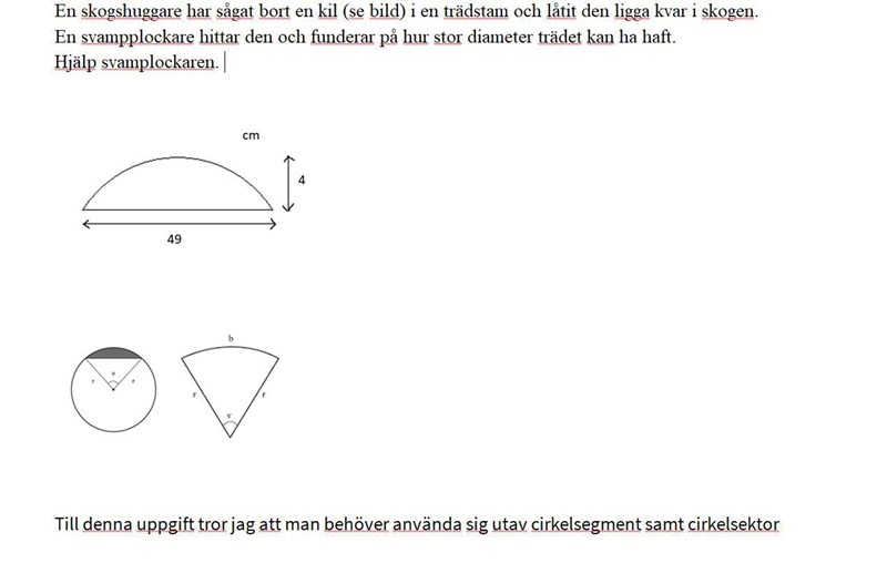 Hej, någon här som har lust att hjälpa mig med en fråga som jag har fastnat för i kursen tillämpat matematik. Att beräkna trädens diameter är fortfarande ett stort frågetecken för mig :/