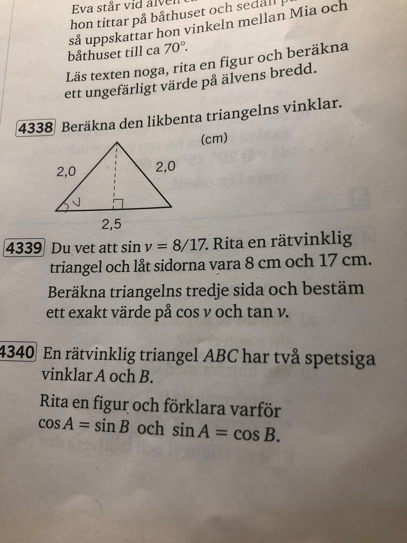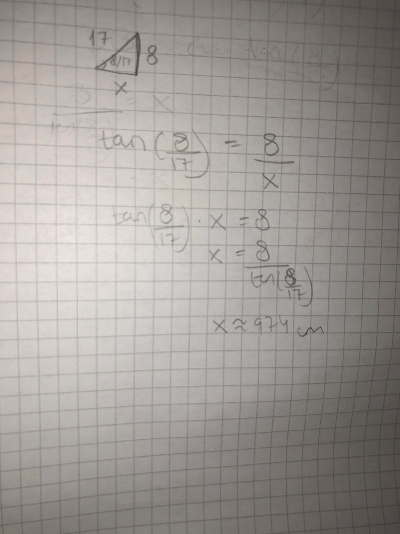 Använd Pythagoras sats för att beräkna x, sedan är cos(v) = x/17 och tan(v) = 8/x.