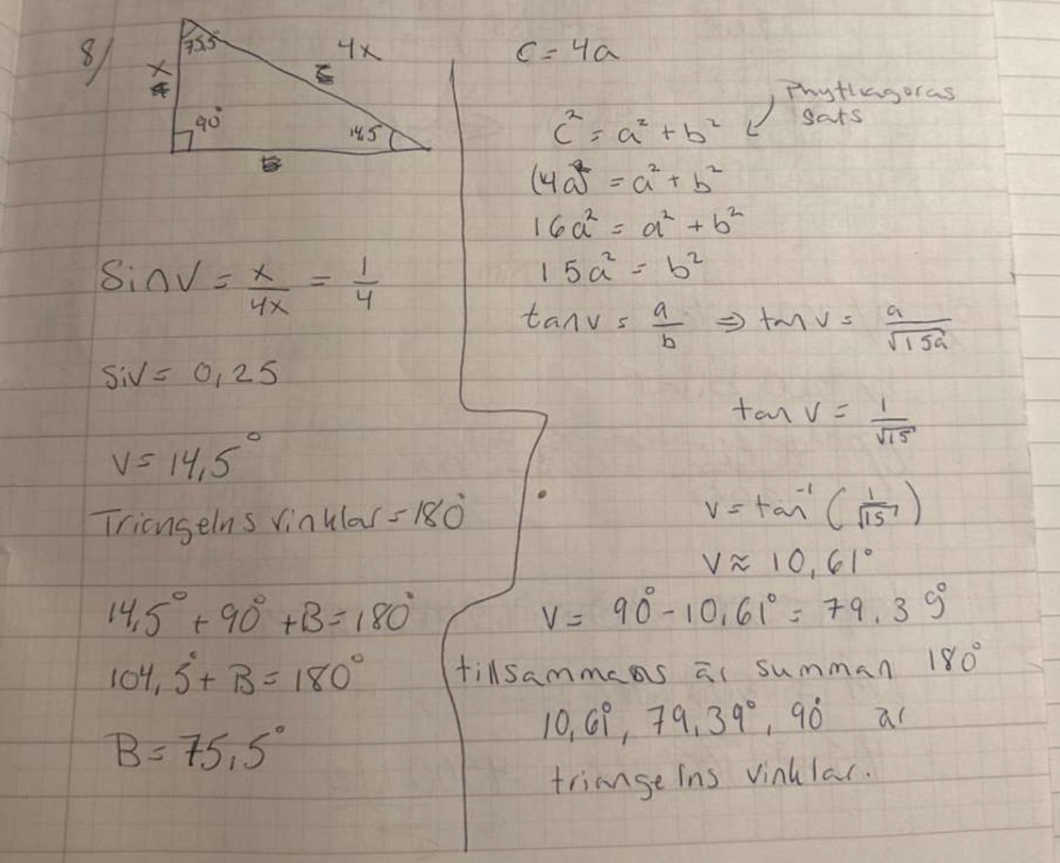 "I en rätvinklig triangel är hypotenusan fyra gånger så lång som den ena kateten. Beräkna triangelns vinklar. Svara med tre gällande siffror"