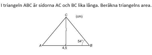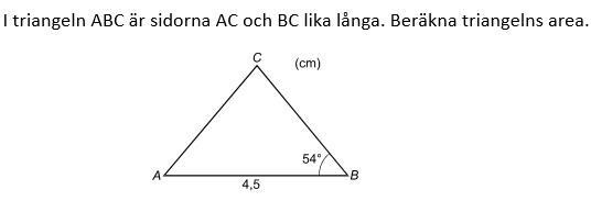 Eftersom triangeln är likbent går det att klura ut storleken hos samtliga vinklar i triangeln. Använd sträckan 4,5 cm och vinkeln i C samt vinkeln i B (54 grader) för att via sinussatsen beräkna längden på sträckan AC.