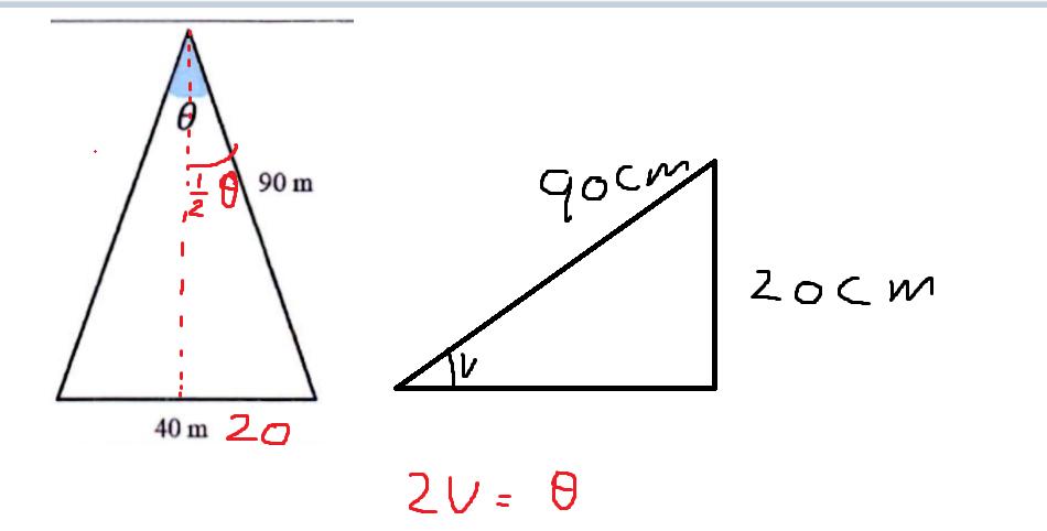 Om jag delar triangeln mitten får jag att vinkeln i mitten blir 90 grader. Är det cosinus jag ska använda mig av för att räkna ut vinkeln då?