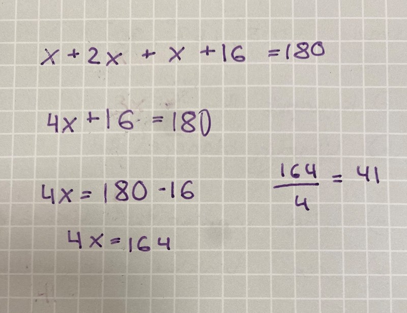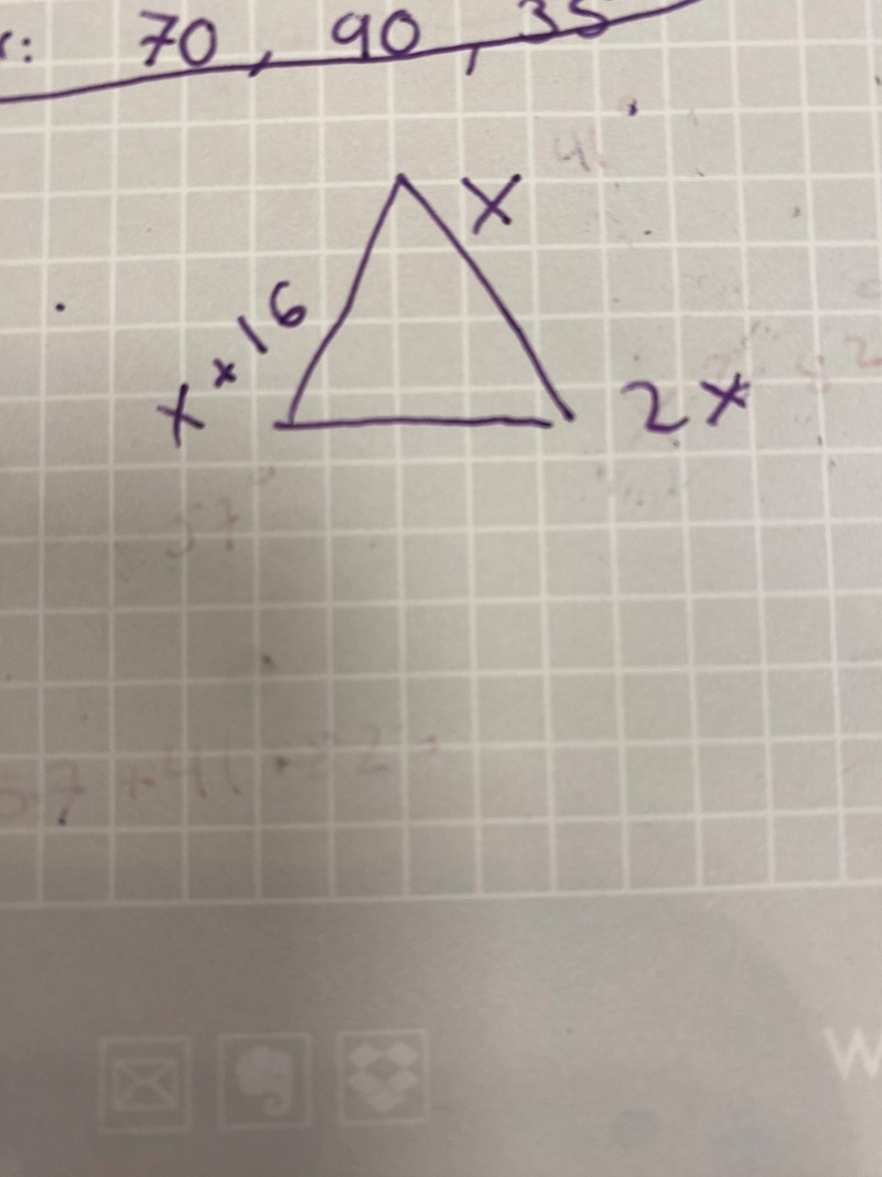 fner skrev:Så som du har ritat din bild är den största vinkeln dubbelt så stor som den minsta vinkeln (x), men i uppgiften står det att den största vinkeln är dubbelt så stor som den NÄST största vinkeln (x+16). Hur kan du då uttrycka de olika vinklarna?