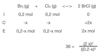 0.2 mol of bromine gas and 0.2 mol of chlorine gas are introduced into a sealed flask with a volume of 5.0 dm3. Under the conditions of the experiment, K = 36.0. How much BrCl will be present at equilibrium?"