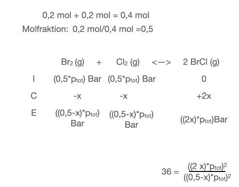 K=(pBrCl(g)/p°)2/((pCl2(g)/p°)*(pBr2(g)/p°)) = (xBrCl (g))2/((xCl2 (g))*(xBr2(g)))"
