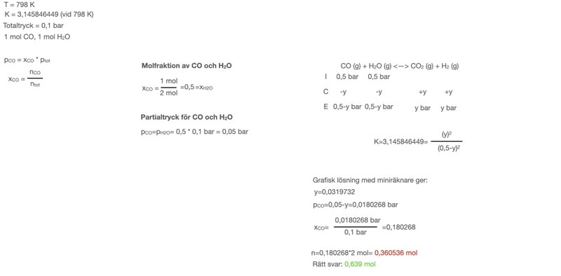 b) 1 mol CO(g) och 1 mol H2O (g) pumpas in i en behållare vid 798 K och totaltrycket 0,1 bar. Beräkna antalet mol av de olika gaserna efter att jämvikt inställt sig."