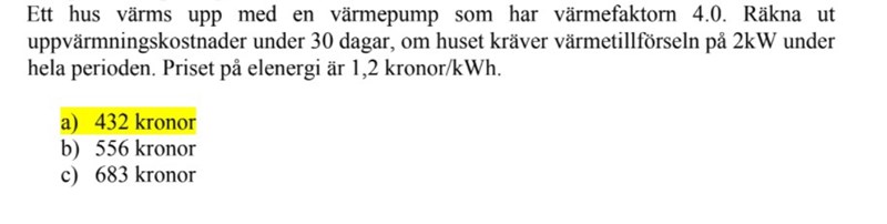 jag fick det till 1440 kWh nämligen dvs. 2000*720=1440 kWh. tror bara det råkades skriva en 7a ist för en 4a vilket förvirrade mig lite. Men resten av uträkningen stämmer så det ska nog vara rätt. tack så mycket återigen