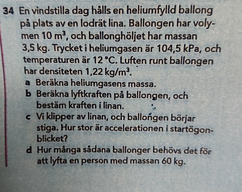 Först tänkte jag att man kunde använda den kinetiska gasteoring med boltzmanns konstant i sig. Däremot så vet vi ju inte medelhastigheten inuti ballongen. Vart ska jag börja på uppgift a)?