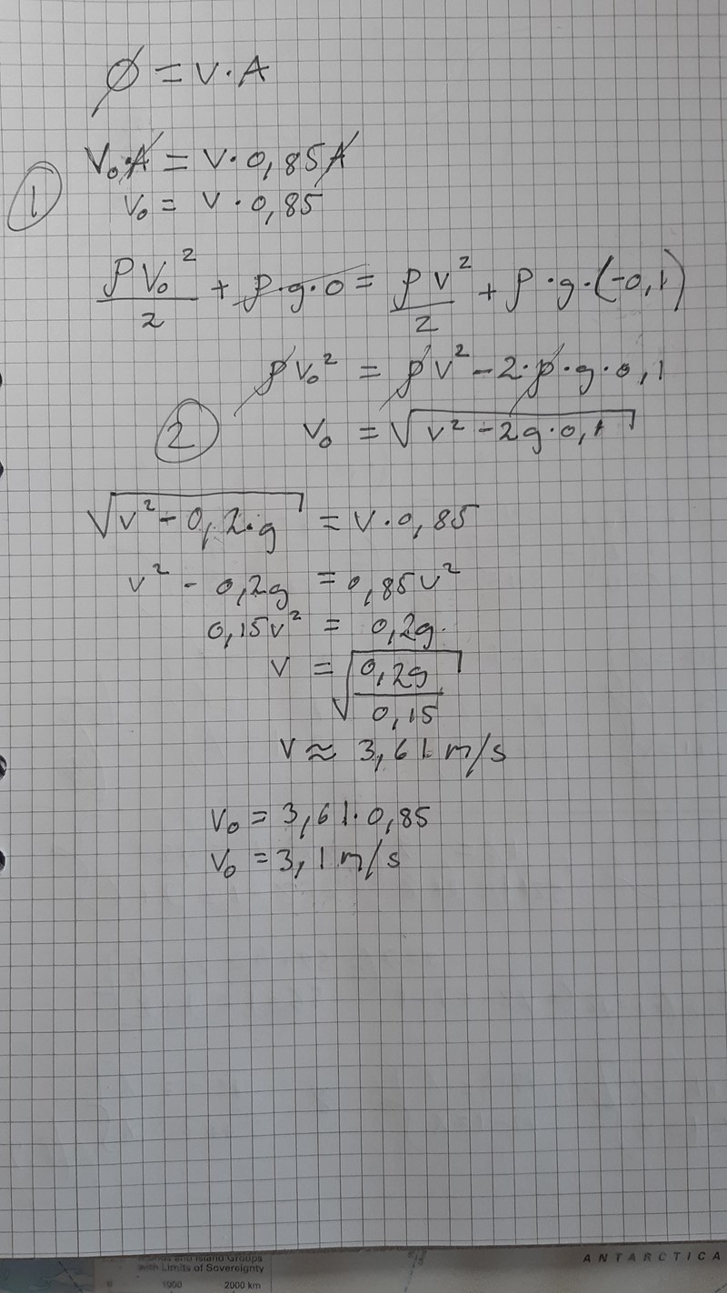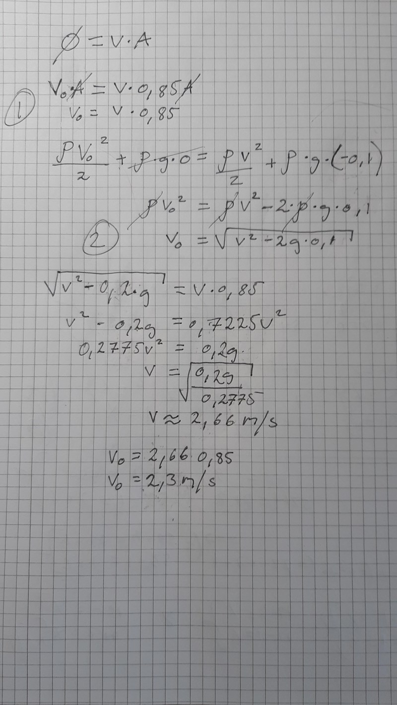 Du har ju redan satt upp en ekvation där arean ingår. Du har två obekanta: V och V0. Sätt upp Bernoullis ekvation så får du ett samband till. Sedan kan du lösa för de obekanta hastigheterna.