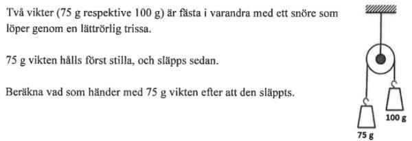 Börja med att rita in alla krafter som verkar på 75 g-vikten och 100 g-vikten när man håller fast 75 g-vikten. Lägg upp bilden här.