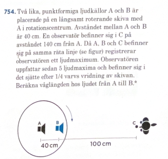 Det är vägskillnaden mellan högtalarna och observatören som ska rymma ett jämnt antal våglängder för att observatören ska uppleva ljudmaximum. Men uppgiften talar inte om hur många våglängder som ryms i AB, bara att det är ett jämnt antal. Alltså kan man inte använda endast den informationen för att lösa uppgiften