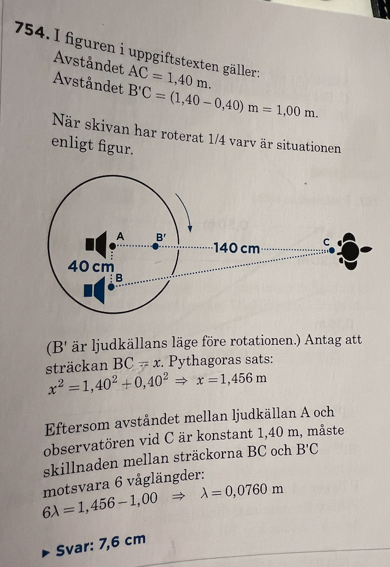 Ledtråden får man istället genom att texten beskriver att "skillnaden i vägskillnad" jämfört med när skivan har roterat, rymmer 6 våglängder, och eftersom AC är lika långt i båda fallen, så är skillnaden i vägskillnad B'C-BC.