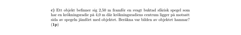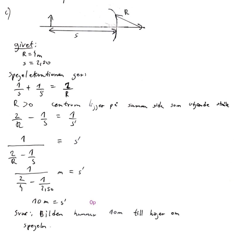 Som ni ser så löste jag uppgiften på det sättet ovan (andra bilden ) och fick tyvärr 0 poäng. Jag vet ej vad som gick snett här. Jag tolkade krökningsradiens centrum som en cirkel med R>0 enligt tecken konvention.