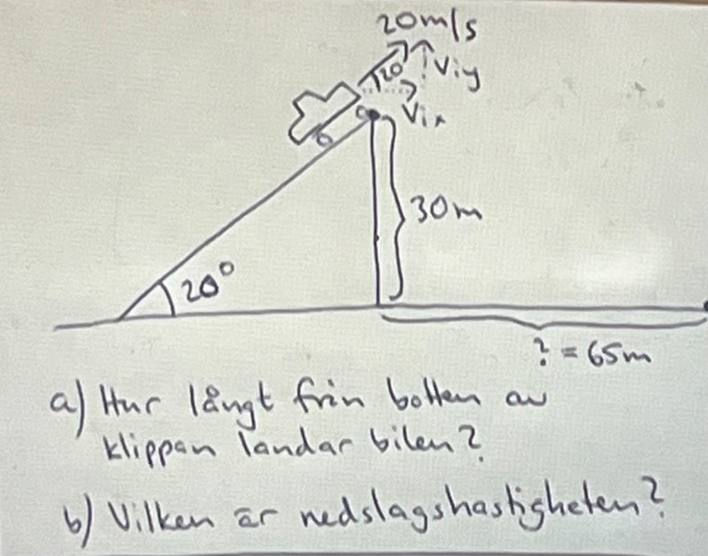 Du behöver räkna ut ett korrekt värde på tiden det tar för bilen att först åka upp lite och sedan åka ner lika mycket, plus 30 meter. När du vet det kan du räkna ut hur långt bort bilen landar.