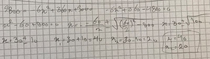 Lös ekvationen 9 800 = -6x2 + 360 x + 5 000