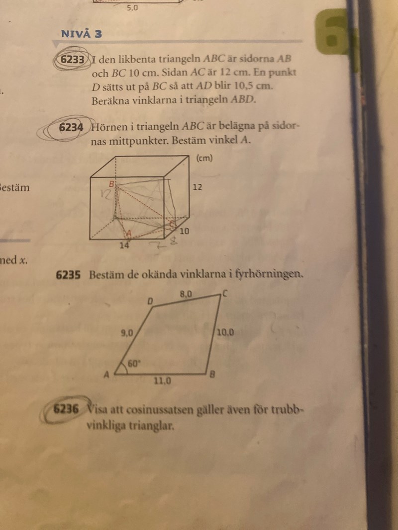 Hej jag behöver hjälp hur jag ska räkna ut triangeln (upp 6234), jag har börjat och fått ut sida AC = 8,6 cm men det tar stopp där. Detta kapitel ska man använda sig av cossinusattsen. Tack för hjälpen:)