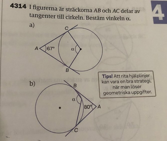 Jag kan inte lösa uppgift B. (A löste jag utan problem då jag känner till att tangenter ligger i 90 graders vinkel mot mittpunkten.) Jag har även flera satser om vinklar i cirkeln i mina anteckningar. Jag tänker att jag borde försöka dela upp figuren i upg B i andra trianglar/fyrhörningar, tex rita in linjerna (mittpunkt, C) och (mittpunkt, B) och då vet jag att vinkeln (B, mittpunkt, C) = 100 grader... Men jag kommer inte vidare från det resonemanget. Skulle uppskatta en förklaring!