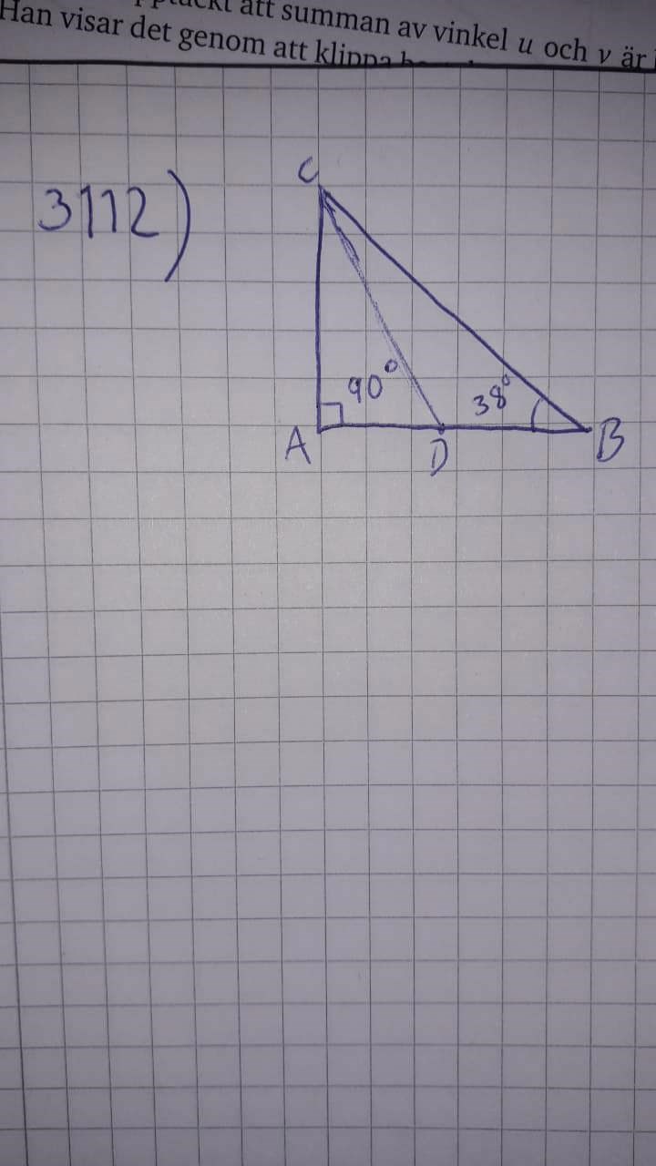 - Du har en rätvinklig triangel där vinkeln A är rät och vinkeln B är 38o. Detta gr att du kan beräkna vinkeln ACB.