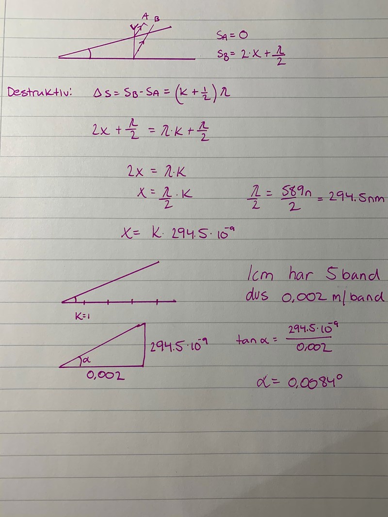 Beräkna vinkeln mellan 2 glasplattor som har ett interferensmönster