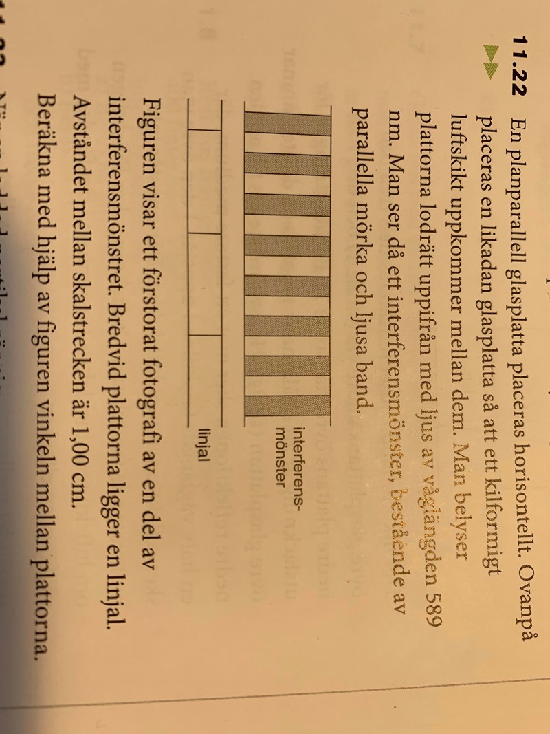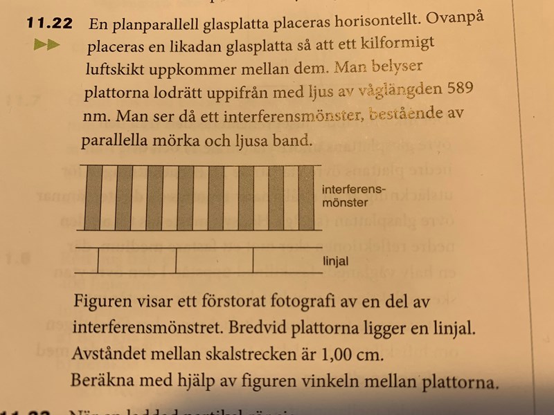 Bilden visar en bild av en del av interferensmönstret och bredvid ligger en linjal med avståndet 1cm mellan skalstrecken. Beräkna m.h.a. bilden vinkeln mellan plattorna.