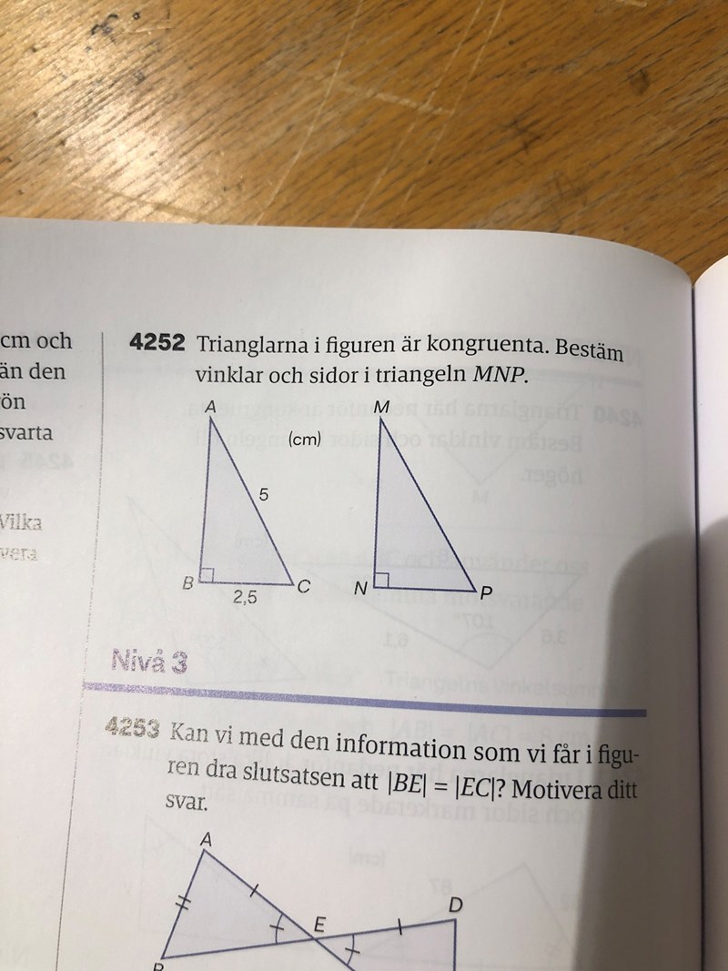 Trianglarna i figuren är kongruenta. Bestäm vinklar och sidor i triangeln MNP.