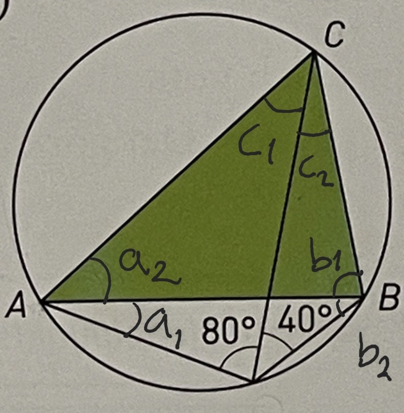 Med hjälp av den givna informationen och denna viktiga sats om fyrhörningar som är inskrivna i en cirkel samt det faktum att vinkelsumman i en triangel är 180° så kan du ställa upp ett antal ekvationer.