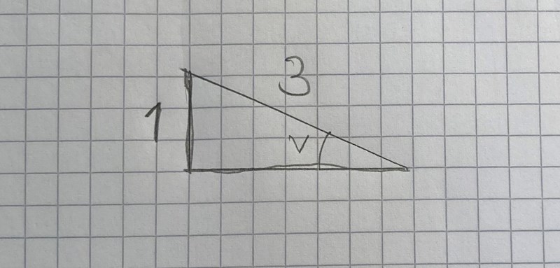 Enhetstriangeln som SvanteR illusterade i tidigare inlägg är också väldigt kraftfull att känna till. Det är sant att det ofta kan leda till förenklade beräkningar. Notera då att båda kommer leda dig till samma svar så det är bara använda den metoden du finner mest bekväm. Du kan tänka på följande vis. Sin(v)=1/3, om du ritar upp samma triangel som Svante, och tar sinus av vinkeln, Sinus är motstående/hyptenusan, alltså är motstående 1 och hypotenusan 3 precis som SvanteR illustrerade i sin triangel. Är du med?