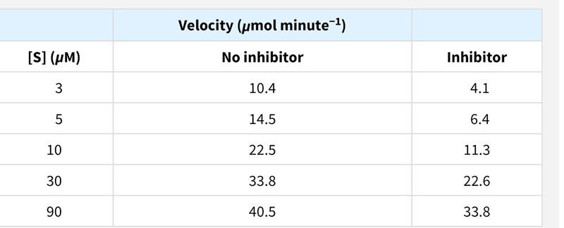 ✦Problem 6 :Inhiberingssätt. enzymets kinetik mäts som en funktion av substratkoncentrationen i närvaro och frånvaro av inhibitor 2μm