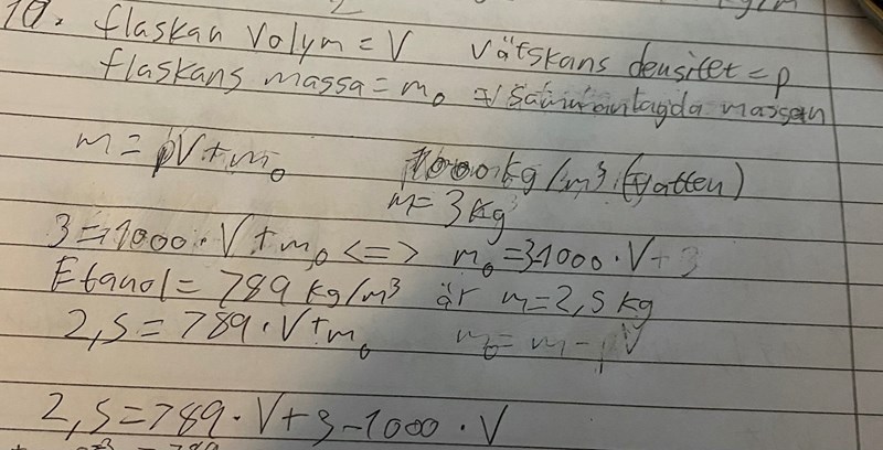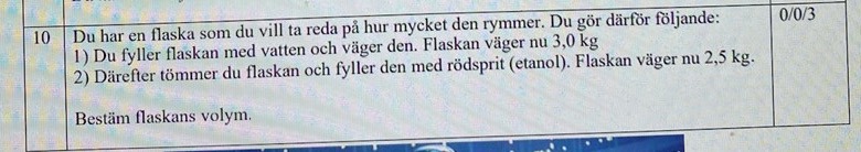 För att kunna lösa denna uppgift behöver du känna till densiteten på både vatten och etanol.
