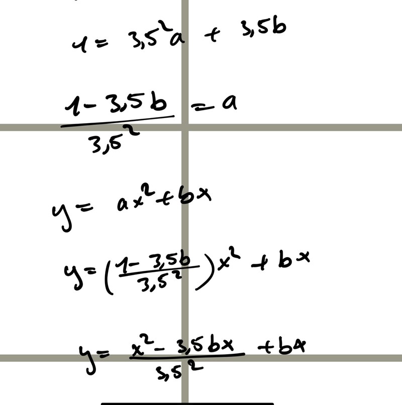 Vi vet att x=3,5 då y = 1. Om vi sätter det in i funktionen kommer vi kunna uttrycka a i b och efter det kan vi sätta a i funktion y=ax^2 +bx. Stämmer den delen?