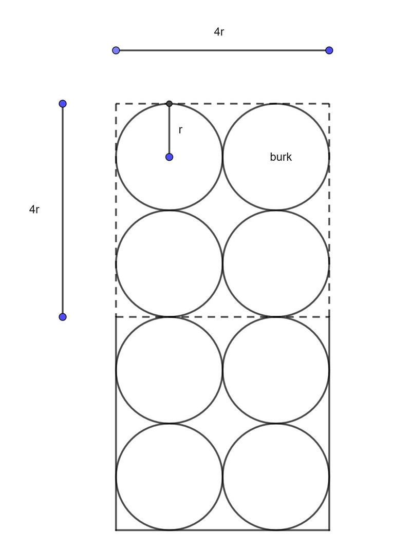 I varje låda finns det 8 burkar i 4x2 mönster. Antag att 2x2 burkar bildar en perfekt kvadrat enligt figuren. Vad är andelen tomrum?