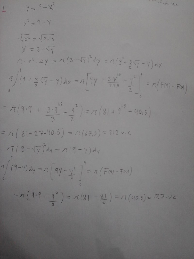 Kurvan y= 9 -x^2 och x-axeln begränsar ett område. Beräkna volymen av det området vid rotation kring y-axeln. Svara volymen med enheten v.e.