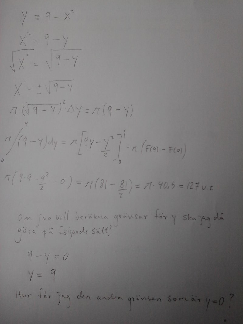 Jag har försökt lösa uppgiften på två olika sätt. De är markerade med rött. På det första så är svaret fel. Jag undrar först om uträkningen är rätt på den första(alltså utförandet av beräkningen och inte beslutet till göra den beräkningen ). Min andra fråga är varför blev svaret fel(Kan det bero på att man söker efter volymen kring y-axeln och inte x-axeln?). Min tredje fråga är angående andra beräkningen, här så är svaret rätt men är beslutet till uträkningen rätt?(för att om man försöker lösa en uppgift som handlar om volymen kring en x-axel på samma sätt så kommer man få fel svar)