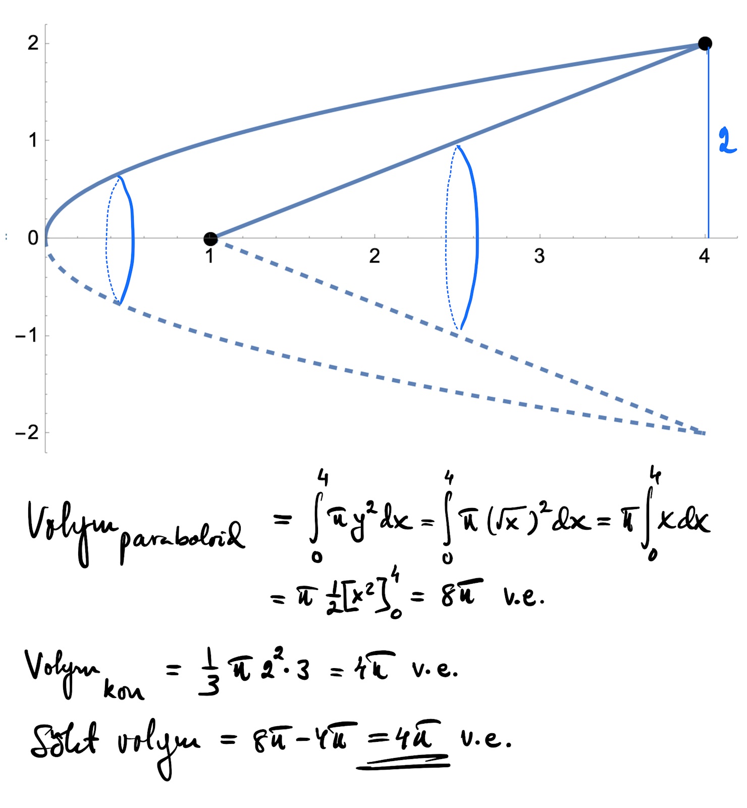 Den räta linjens ekvation blir med de givna punktern: f(x)= 2x/3 - 2/3. g(x) = Områdets volym bör kunna på följande sätt vid rotation kring x - axeln: