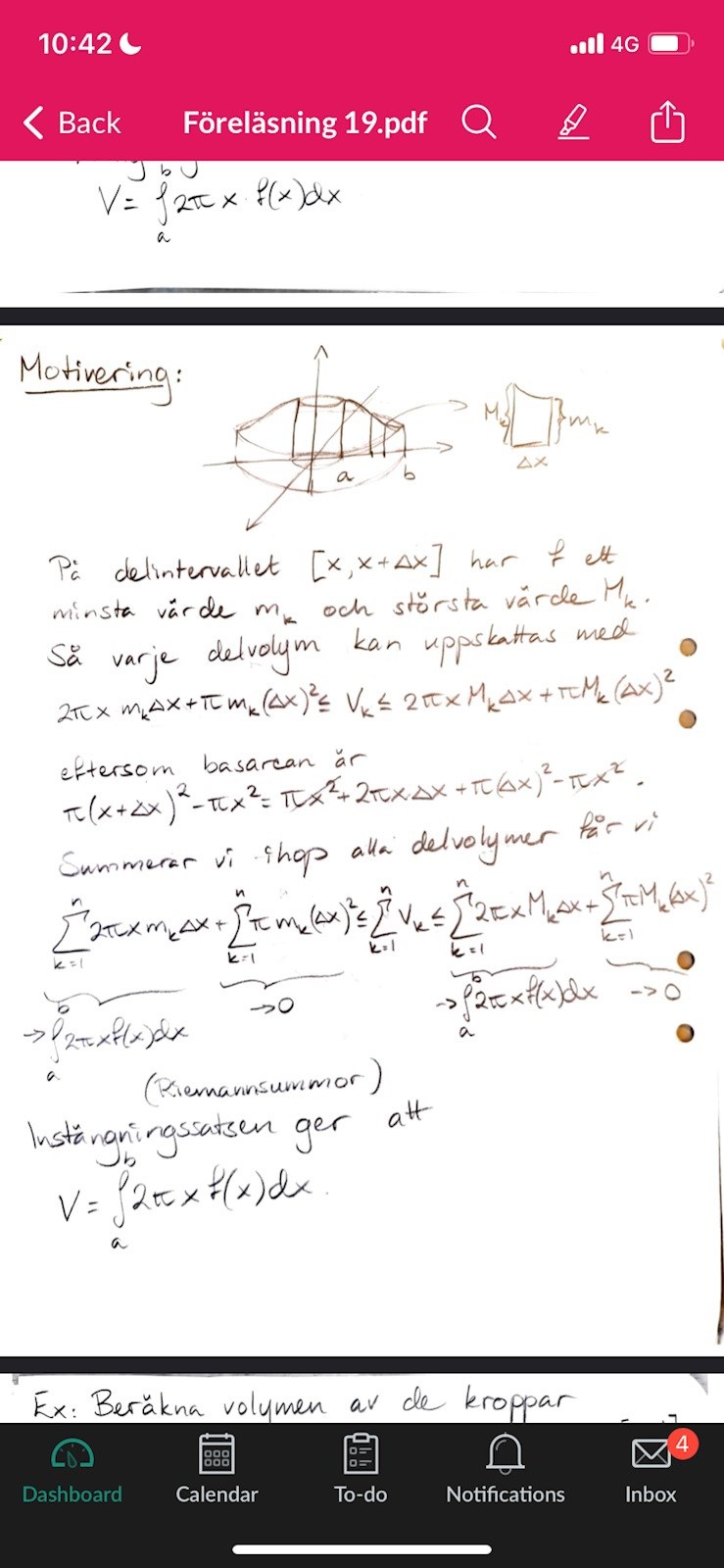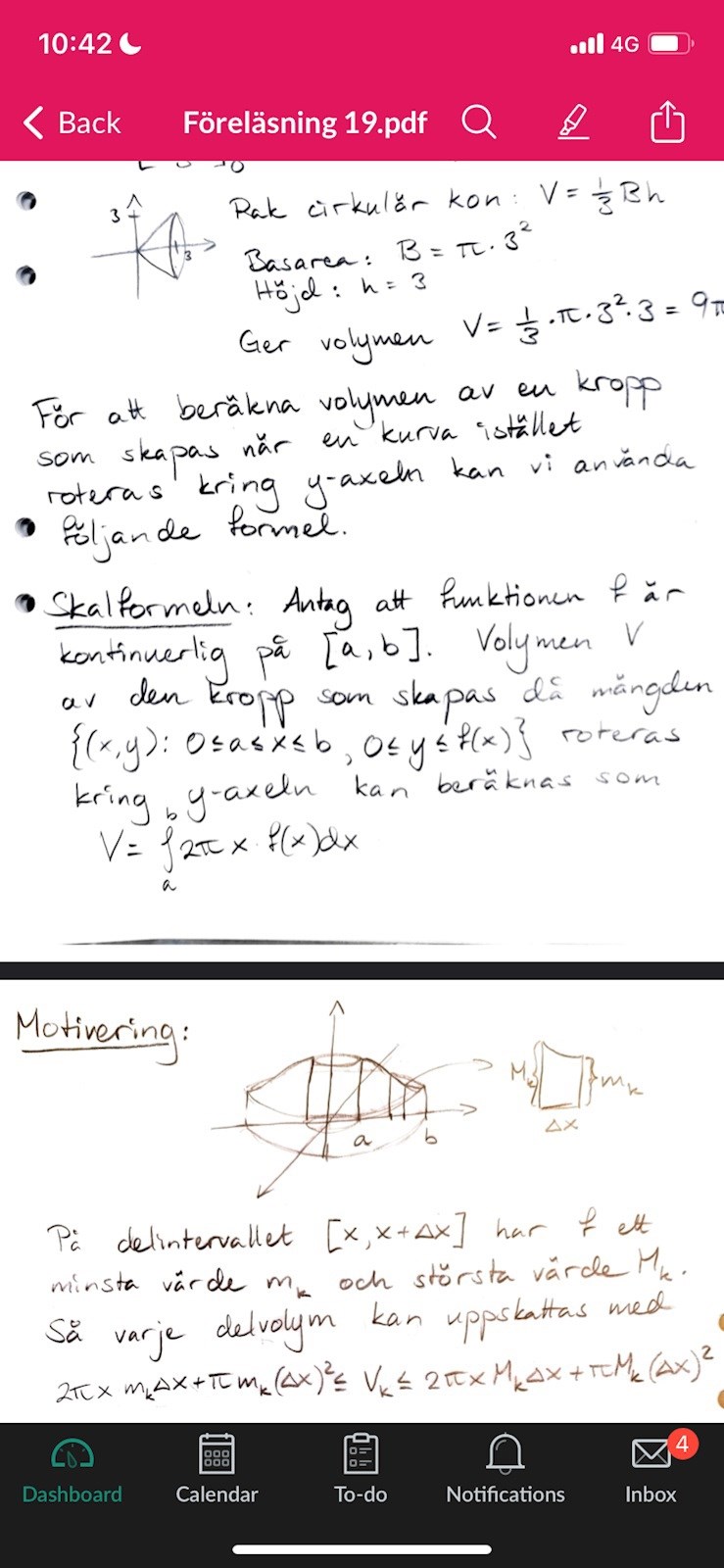 Verkar som ett bra val (det skulle nog funka med skalmetoden också). Du ser att figuren är rotationssymmetrisk, så varje skiva kommer att bli en cirkelskiva. Vilka kommer dina integrationsgräser bli?